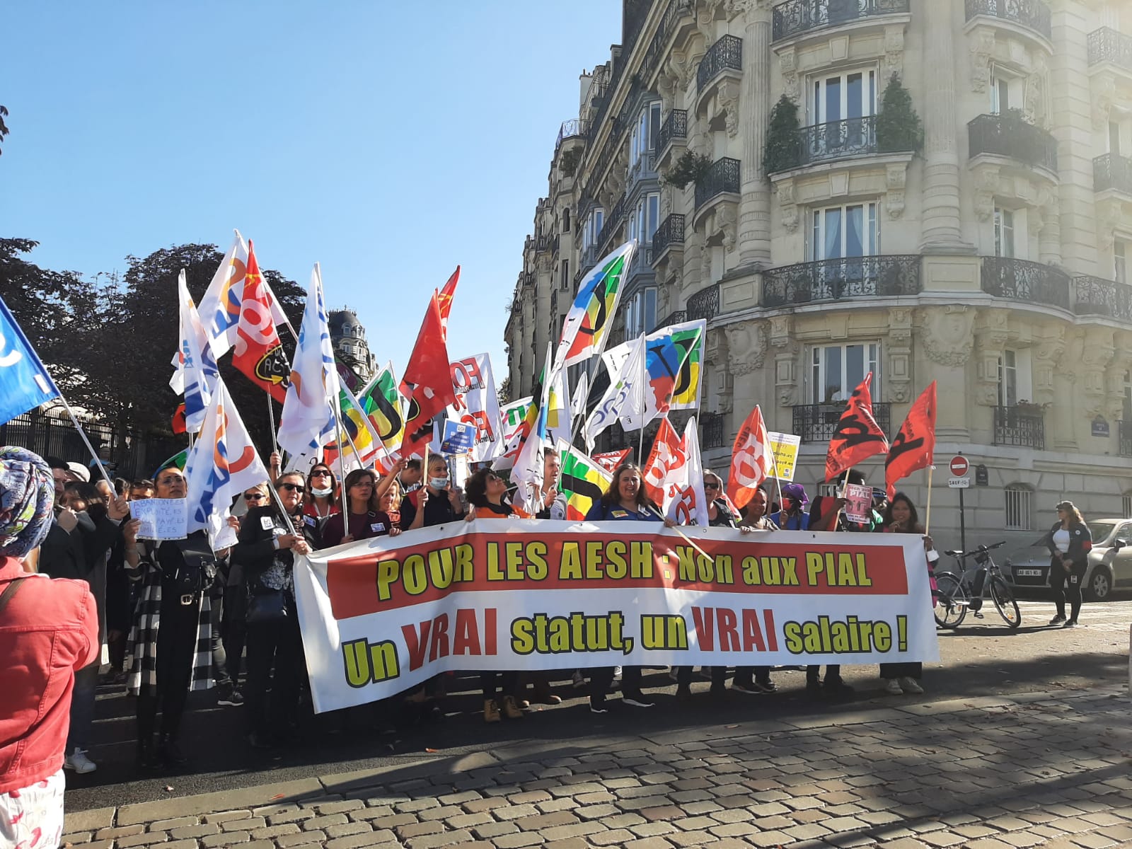 Partout en France, les AESH se sont mobilisé.e.s le mardi 19 octobre pour faire entendre leur voix. Précarisé.e.s, mal payé.e.s, rattaché.e.s par des PIAL qui les malmènent, elles et ils sont plus que jamais essentiel.le.s dans nos établissements. Mardi, elles et ils ont pu faire entendre leur colère dans le cortège parisien. En effet, si des rassemblements locaux avaient lieu à Saint-Lô, à Alençon, à Caen et au Havre, les FSU 76 et 27 avaient fait le choix d’emmener les AESH à Paris. C’est donc sous le soleil que les AESH, dans un cortège dynamique et combatif, ont pu exiger la fin des PIAL et un vrai statut pour toutes et tous.