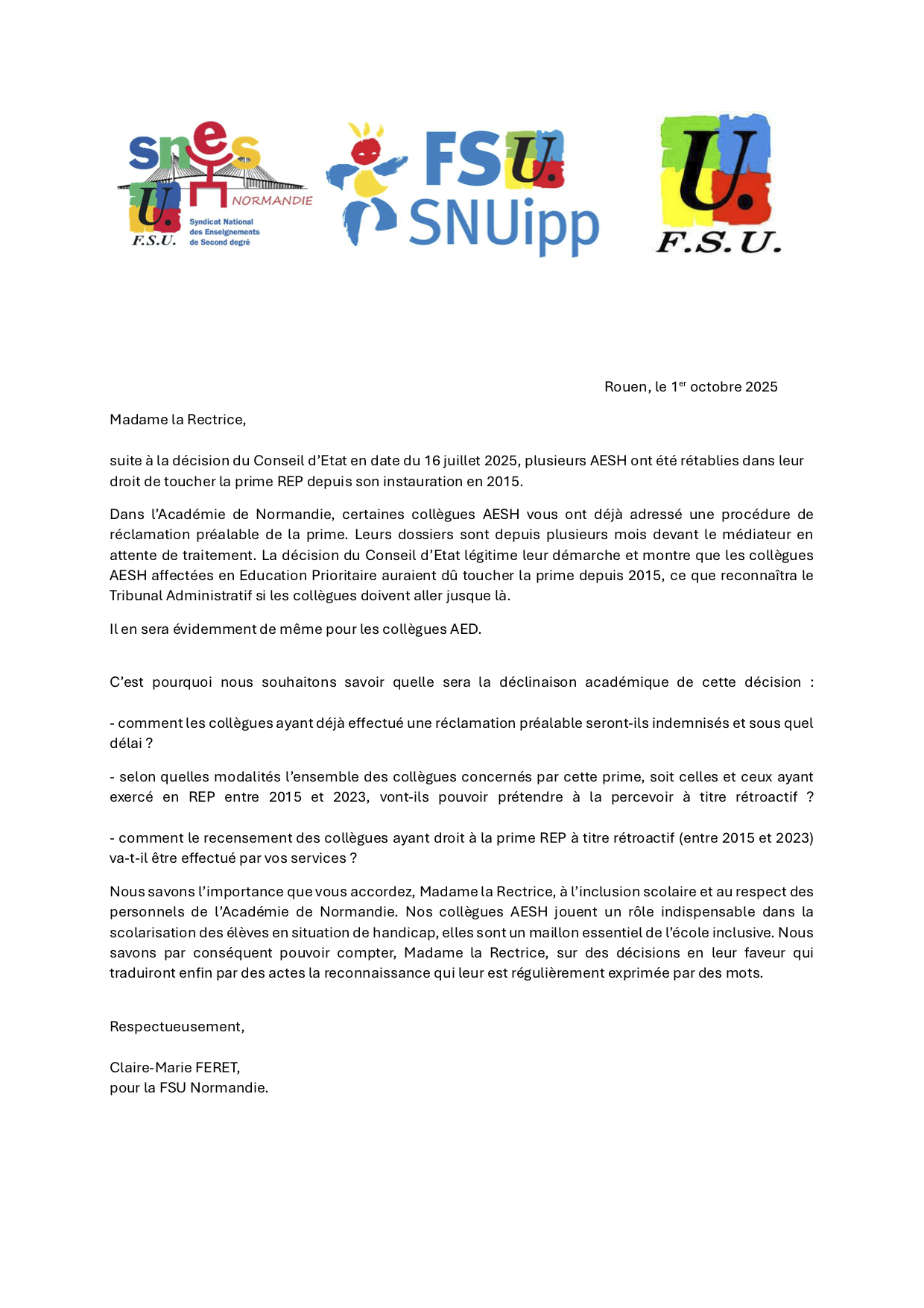 Toutefois, pour l’instant, les rectorats se montrent bien silencieux et les démarches pour obtenir cette prime risquent d’être longues pour les collègues. C’est pourquoi la FSU s’est adressée à la rectrice de Normandie, pour simplifier les démarches des collègues et obtenir que ce droit s’étende effectivement à tous les personnels, AED et AESH.