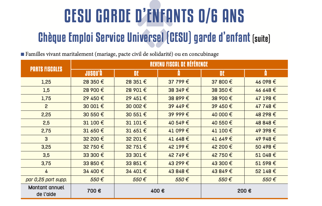 Pour favoriser le maintien de l’activité professionnelle des parents, l’État a mis en place en 2007 le Chèque Emploi Service Universel garde d’enfant. Délivré sous forme de titre spécial de paiement préfinancé par l’État, le CESU permet de rémunérer les salariés ou organismes à qui vous faites appel pour la garde de votre enfant de moins de 6 ans.