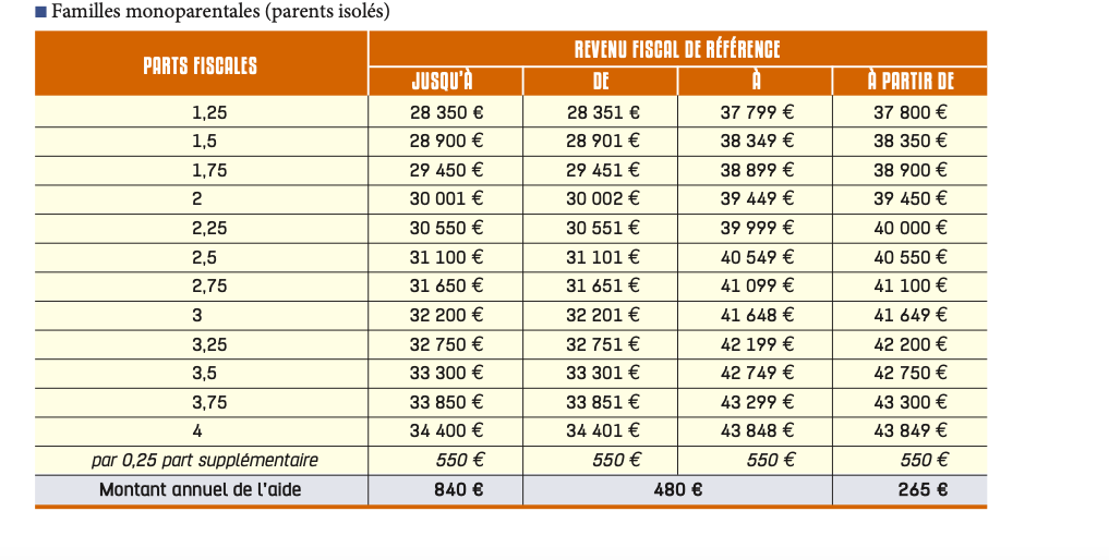 - Pour les familles monoparentales, l’aide est soumise à un plafond de ressources et son montant en année pleine est de 480 € ou 840 €.