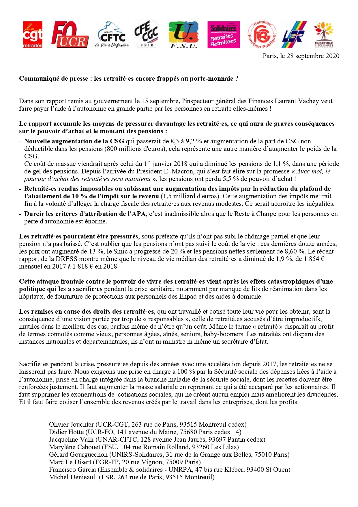 Vous êtes ici : Accueil Votre situation En retraite communiqué de presse : les retraités encore frappés au porte monnaie ? 29 septembre 2020 Votre situation communiqué de presse : les retraités encore frappés au porte monnaie ? Imprimer l'article communiqué de presse : les retraités encore frappés au porte monnaie - version PDF