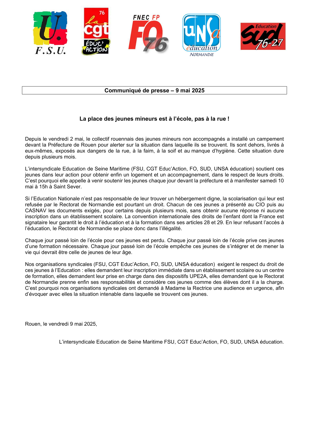 Vous êtes ici : Accueil Actualités Communiqué de presse - mineurs isolés 9 mai 2025 Actualités Communiqué de presse - mineurs isolés Imprimer l'article Communiqué de presse - 09/05/2025