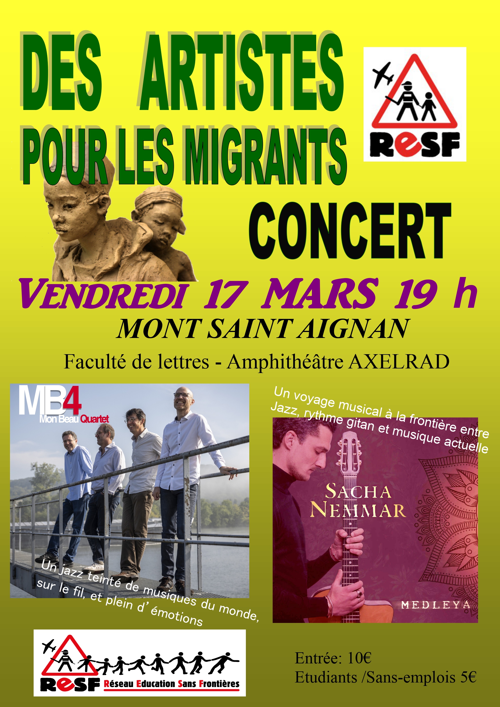 Attaché à la défense des Droits de l’Homme et des Droits à l’Education ,il aide gratuitement les familles sans papiers parents d’enfants scolarisés, les mineurs non accompagnés et les jeunes majeurs étrangers à constituer leurs dossiers de demande de titre de séjour auprès de la préfecture. Nous organisons leur soutien et notamment les démarches administratives et juridiques qui ont un coût .Nous avons donc besoin de ressources. C’est la raison pour laquelle, n’ayant pas de subventions, nous organisons ce concert au profit du RESF afin qu’il continue à mener à bien ses actions en faveur des étrangers sans papiers.