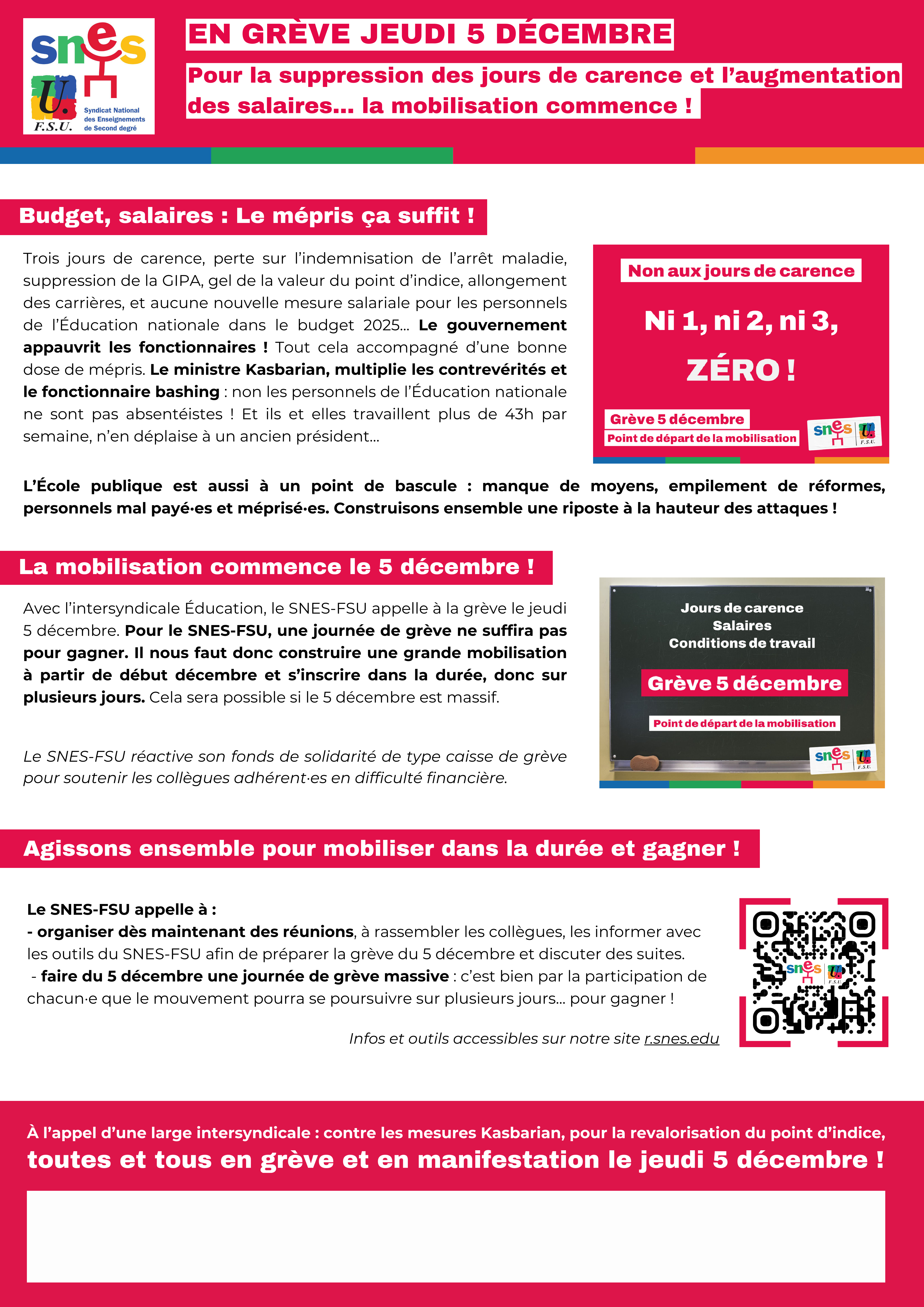Une large intersyndicale de la Fonction publique appelle à se mobiliser le 5 décembre, une première journée de mobilisation (voir le communiqué). Le SNES-FSU appelle à la grève le jeudi 5 décembre. Pour le SNES-FSU, une journée ne suffira pas pour gagner. Il nous faut donc construire une grande mobilisation à partir de début décembre qui pourra s’inscrire dans la durée, donc sur plusieurs jours. Cela sera possible si la grève est massive le 5 décembre. Pour que cette journée soit le point de départ d’une mobilisation qui monte en puissance et qui dure, la grève du 5 décembre doit être massive. La participation de chacun à cette journée sera décisive pour construire les suites.