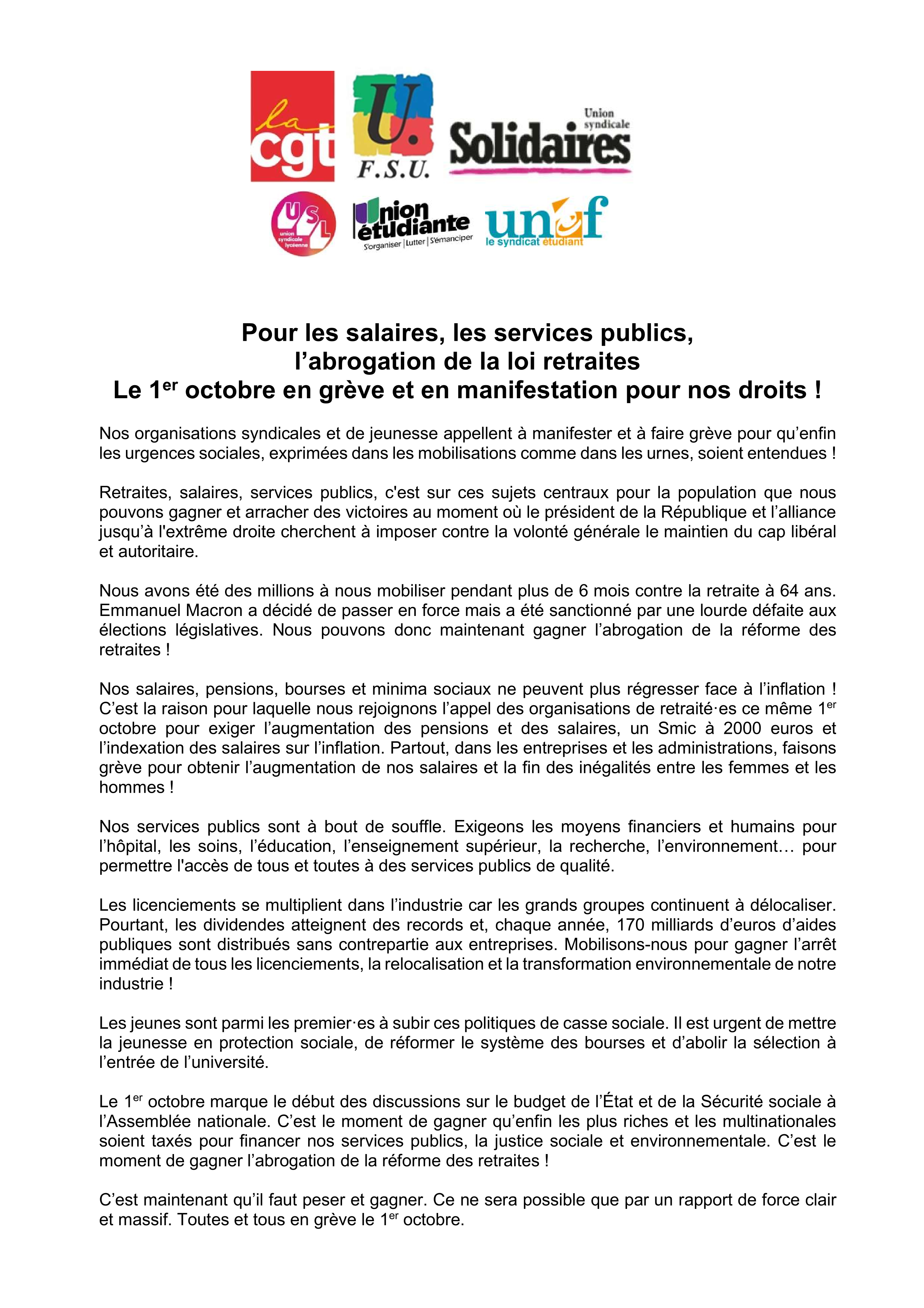 Pour gagner sur ces revendications, pour que des réponses soient apportées tant par le futur gouvernement que par le Parlement, les organisations syndicales de la Fonction publique CGT, FSU et Solidaires appellent les agent.es publics, actifves et retraitées, à se mobiliser dans le cadre de la journée interprofessionnelle unitaire du 1er octobre en participant massivement aux manifestations et par la grève.