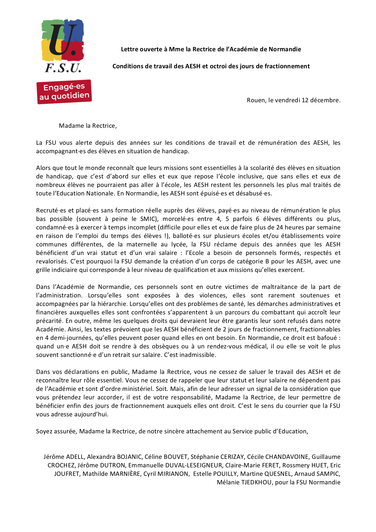 Si l’absence de statut et l’indécence de leur salaire sont de la responsabilité du ministère, le refus de faire bénéficier les AESH de ces jours de fractionnement qui sont un droit est une décision de l’Académie de Normandie.