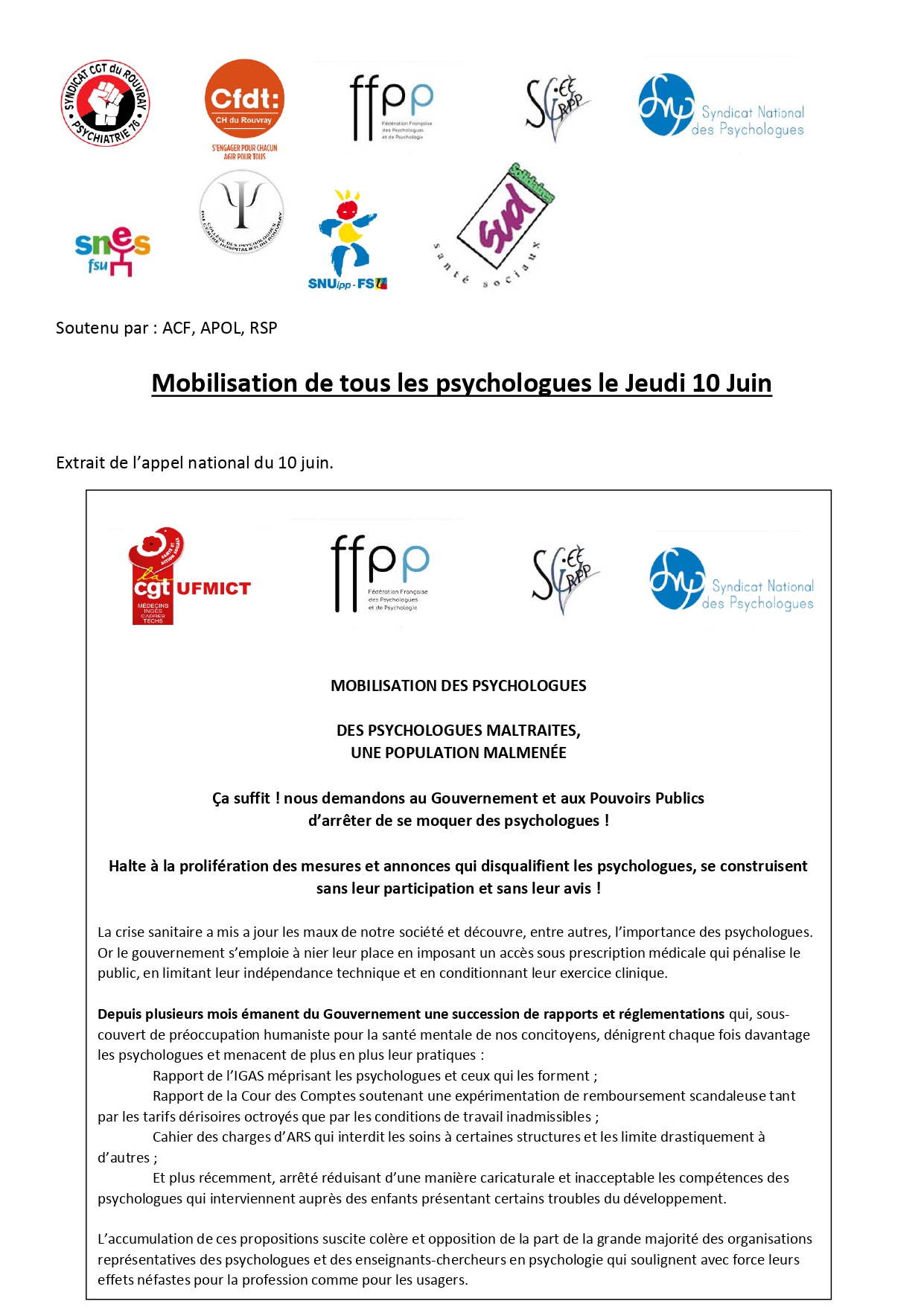 - Mobilisation de TOUS les psychologues le 10 juin ! Rendez-vous devant la préfecture à Rouen à 13H30.