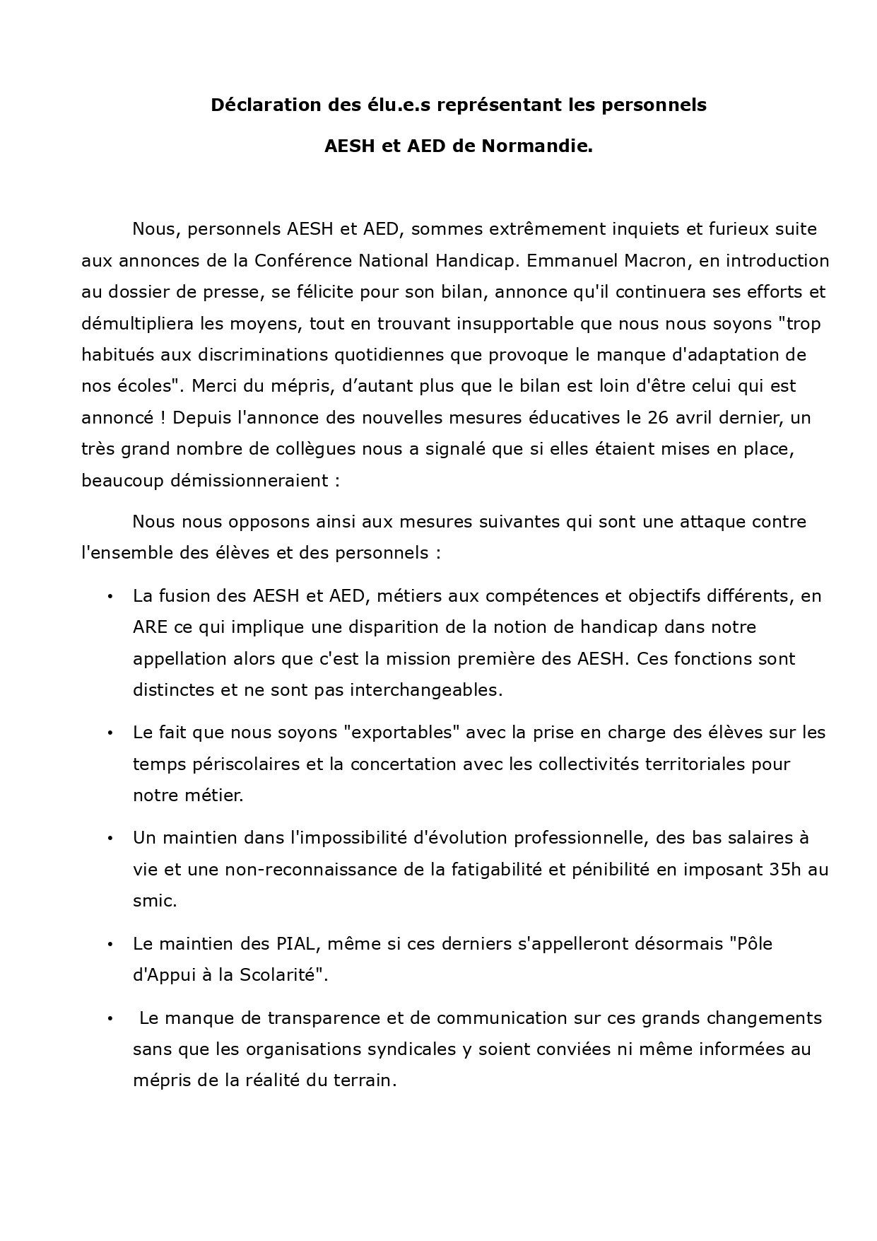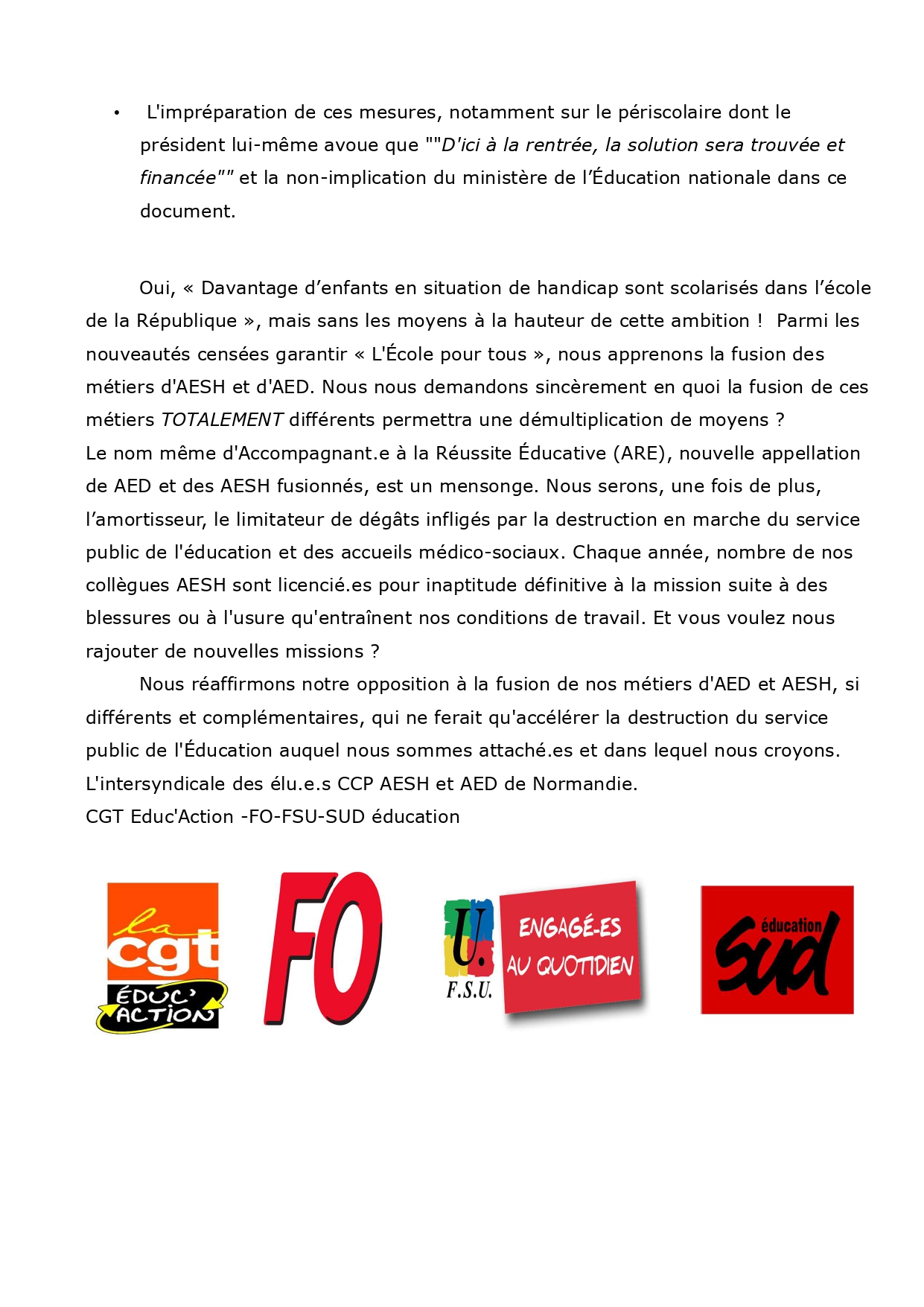 Vous êtes ici : Accueil Votre situation Assistants d’éducation Déclaration des élu.e.s représentant les personnels AESH et AED de Normandie du 12 mai 2023 16 mai 2023 Votre situation Déclaration des élu.e.s représentant les personnels AESH et AED de Normandie du 12 mai 2023 Imprimer l'article