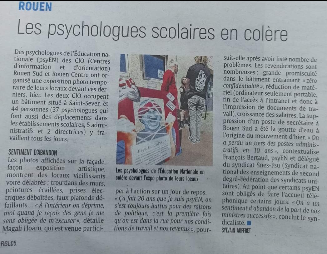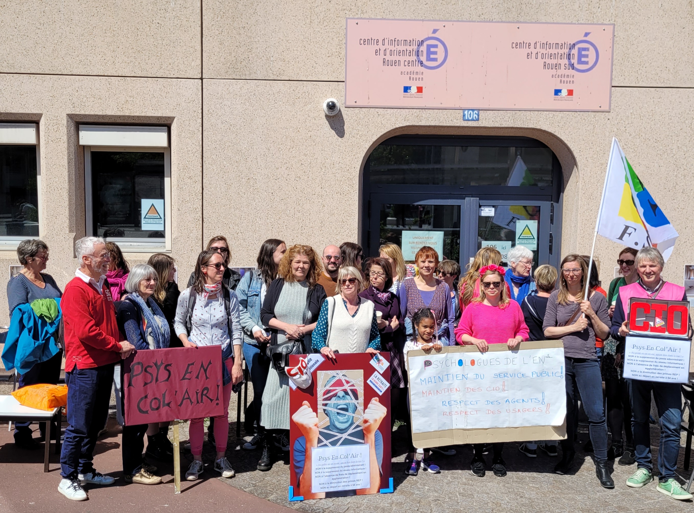 Une trentaine de « Psys En Col’ Air » ont organisé un CIO en plein air devant le CIO de Rouen Sud pour tirer la sonnette d’alarme après l’annonce du projet de suppression d’un poste d’administratif au CIO de Rouen Sud. Comment le CIO de Rouen Sud pourra-t’il continuer de fonctionner correctement avec un seul poste de personnel administratif ? Au cours des 10 dernières années, les CIO ont perdu 1/3 des postes administratifs !