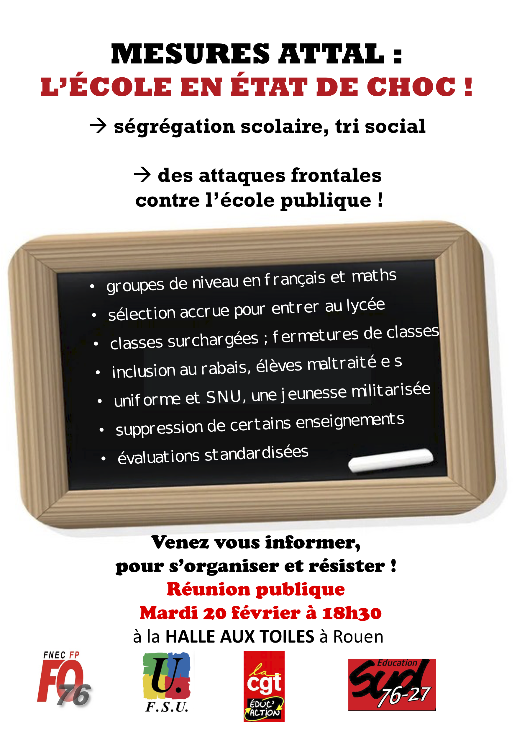 Les organisations syndicales de l’Éducation Nationale vous invitent à une réunion publique à Rouen le mardi 20 février pour vous informer sur le choc des savoirs et construire ensemble la défense de l’École Publique.
