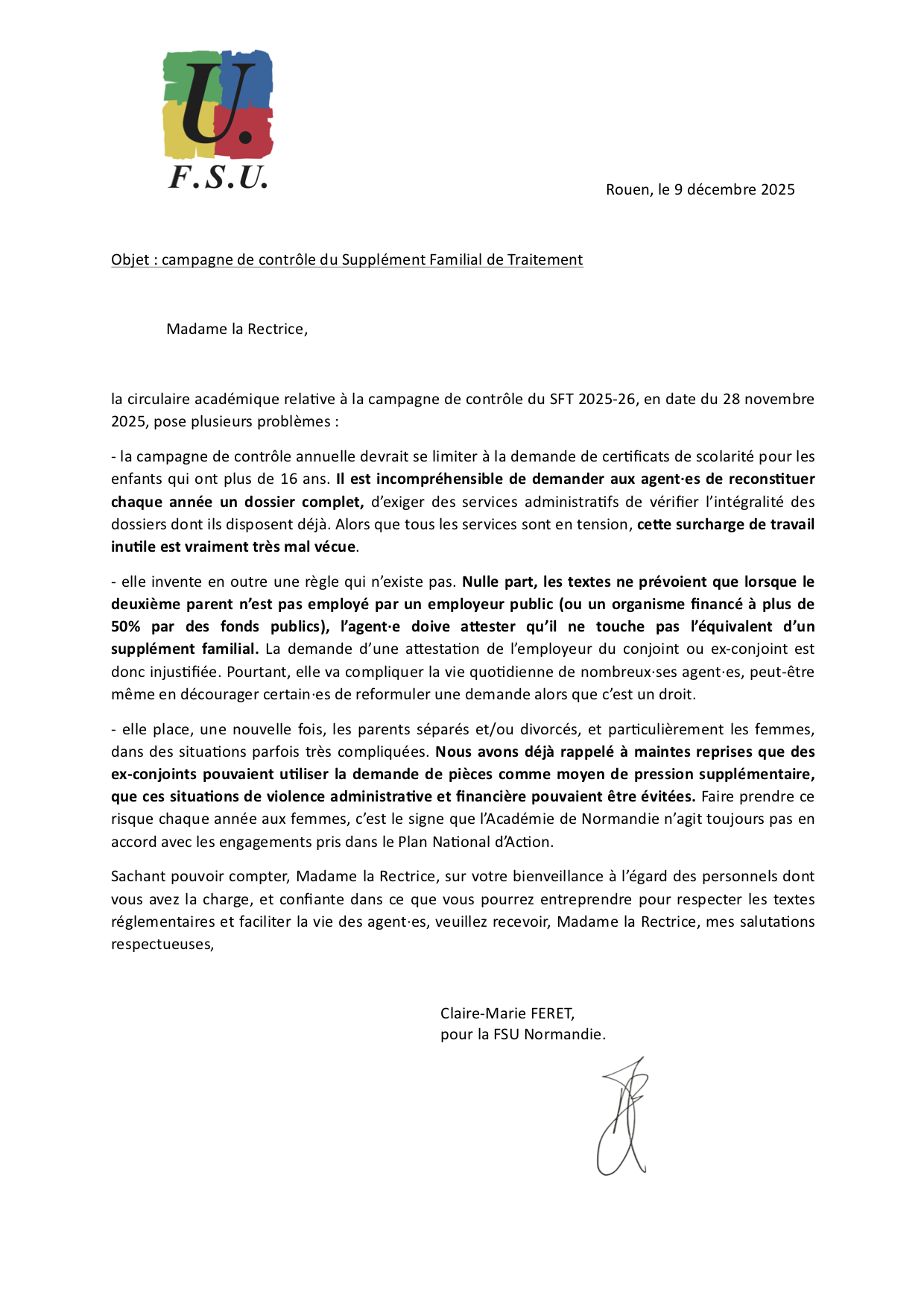 La FSU a adressé ce jour un courrier à la Rectrice pour que la circulaire académique soit revue. Vous le trouverez ci-dessous.