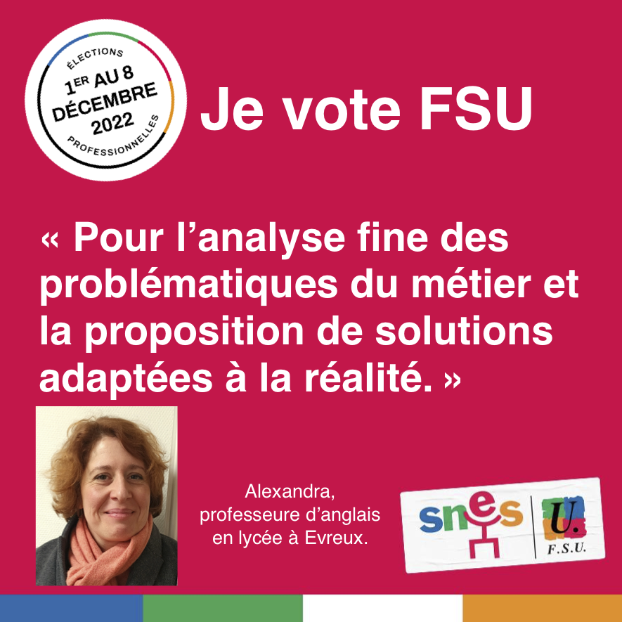 « Je vote FSU parce que ce sont des collègues qui travaillent vraiment à la défense de nos intérêts et parce qu’elle prône une école ambitieuse pour toutes et tous. »
