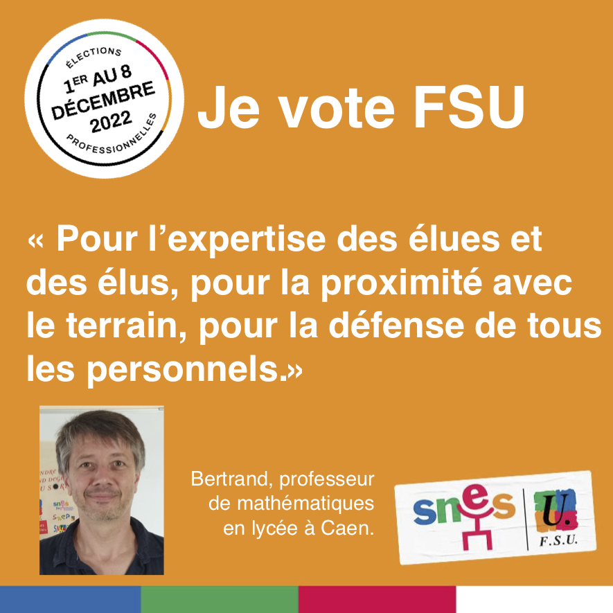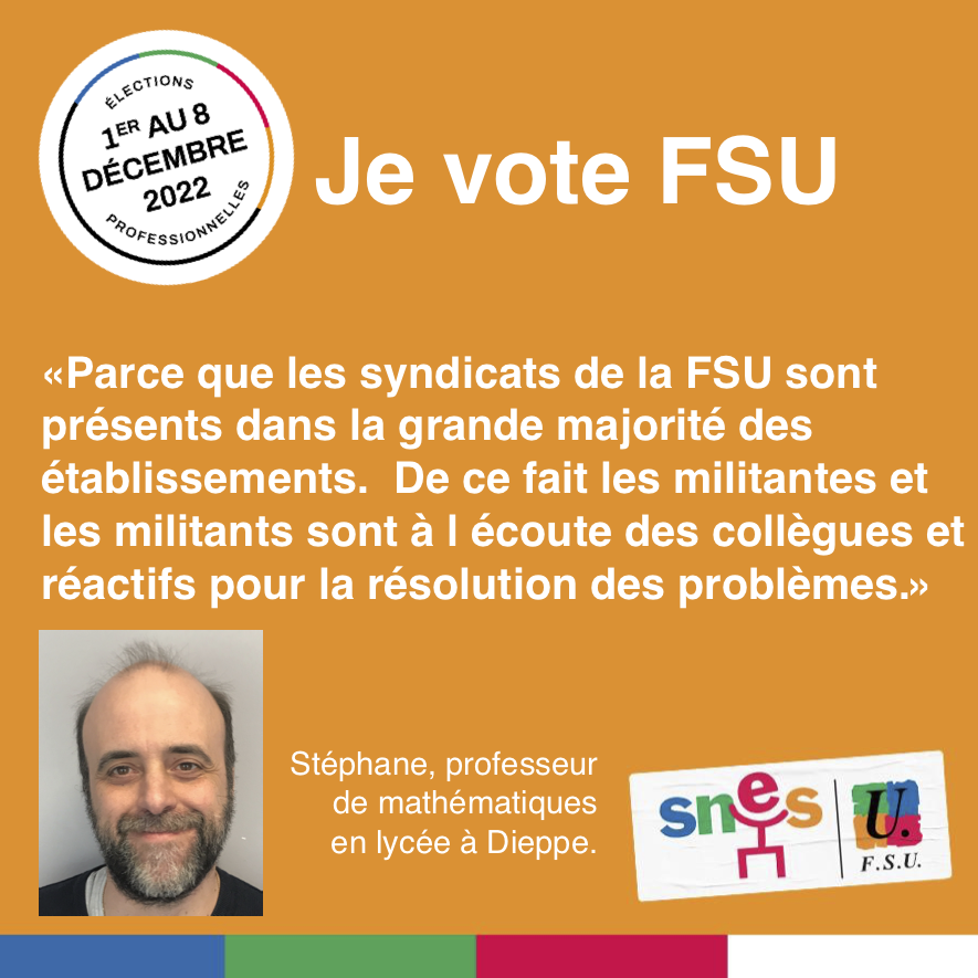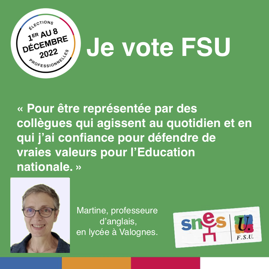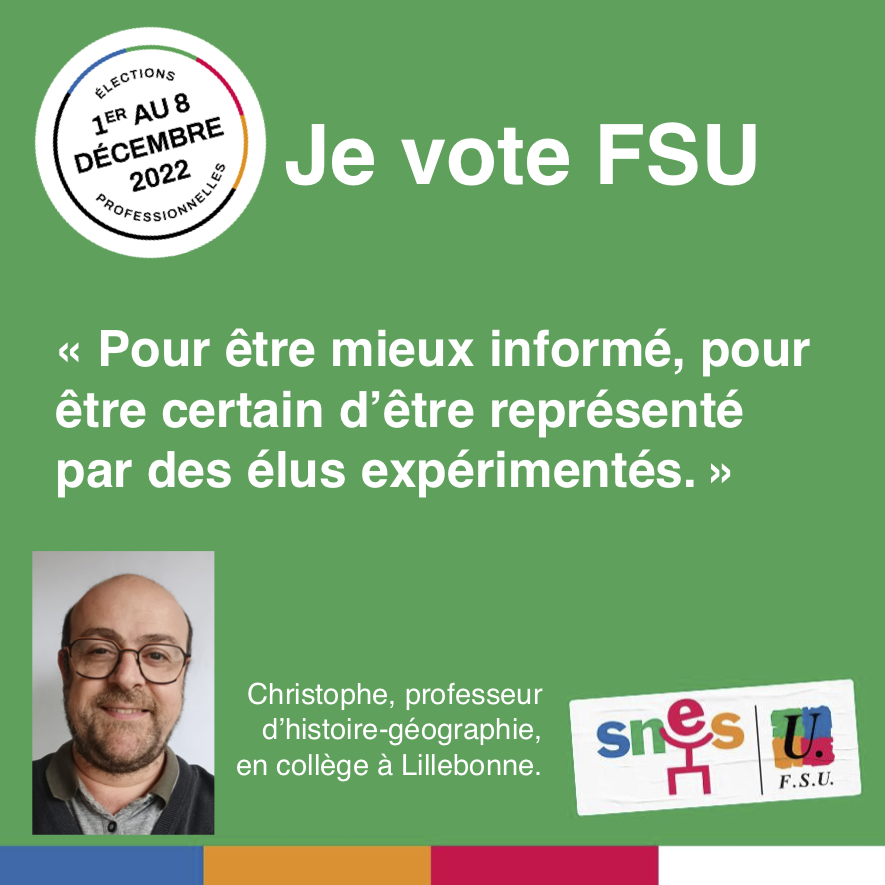 « Je vote FSU pour être mieux informé, pour être certain d’être représenté par des élus expérimentés. La FSU défend des valeurs pour un service public efficace et lutte contre les attaques qui lui sont faites. »