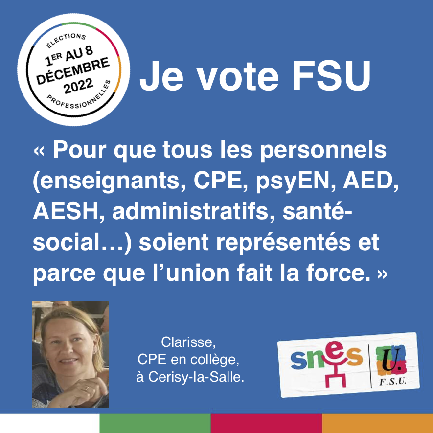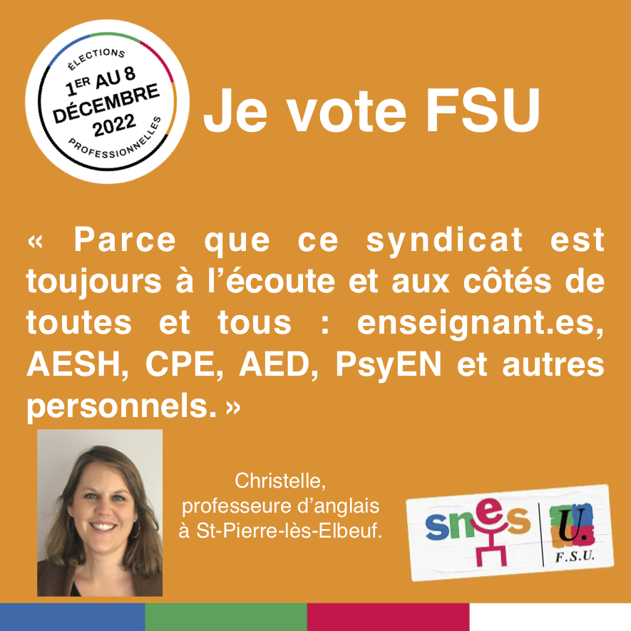 "Je vote FSU parce que ce syndicat est toujours à l’écoute et aux côtés de toutes et tous : enseignant.es, AESH, CPE, AED, PsyEN et autres personnels.