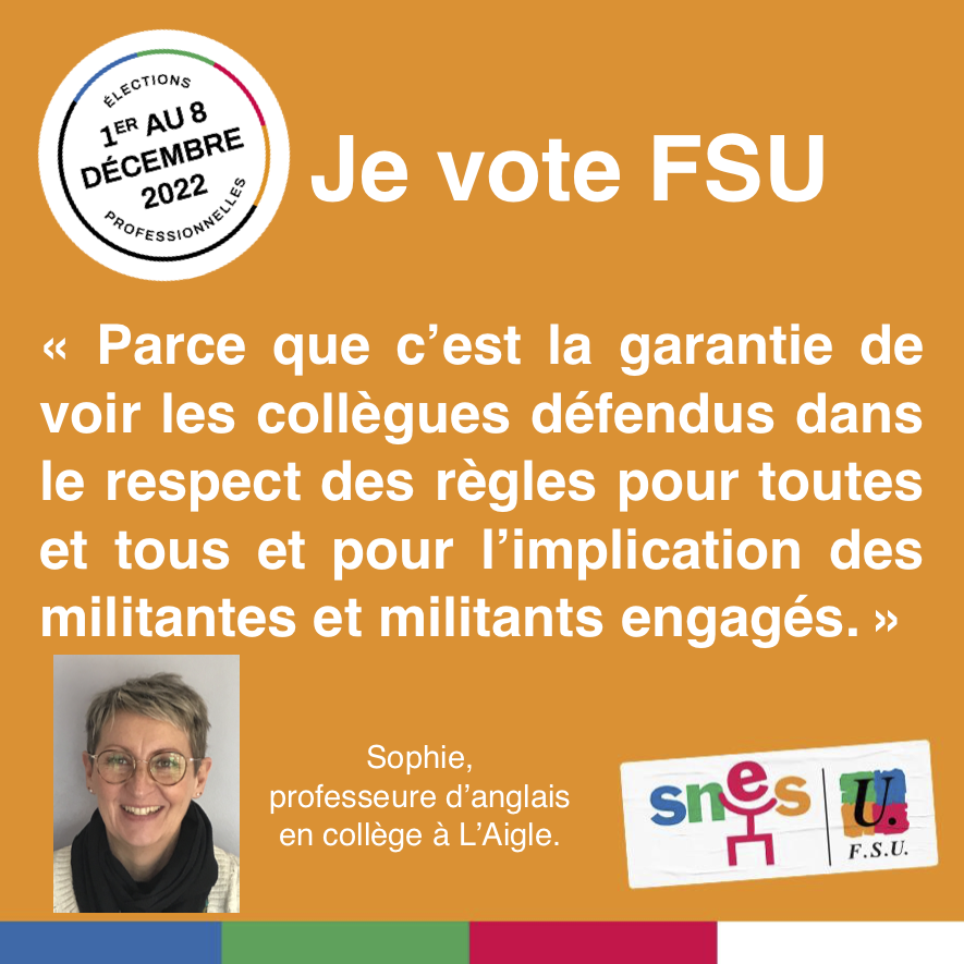 « Je vote FSU parce que c’est la garantie de voir la situation des collègues défendue dans le respect des règles pour tous, c’est la fiabilité des informations données, c’est aussi l’implication et le sérieux des militants engagés. »