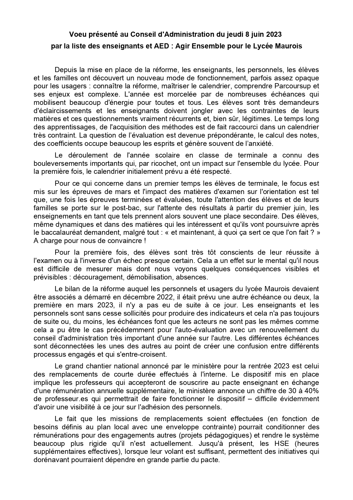 Vous êtes ici : Accueil Actualités Échos des établissements Voeu présenté au CA du lycée André Maurois A Elbeuf du jeudi 8 juin 2023 9 juin 2023 Actualités Voeu présenté au CA du lycée André Maurois A Elbeuf du jeudi 8 juin 2023 Imprimer l'article